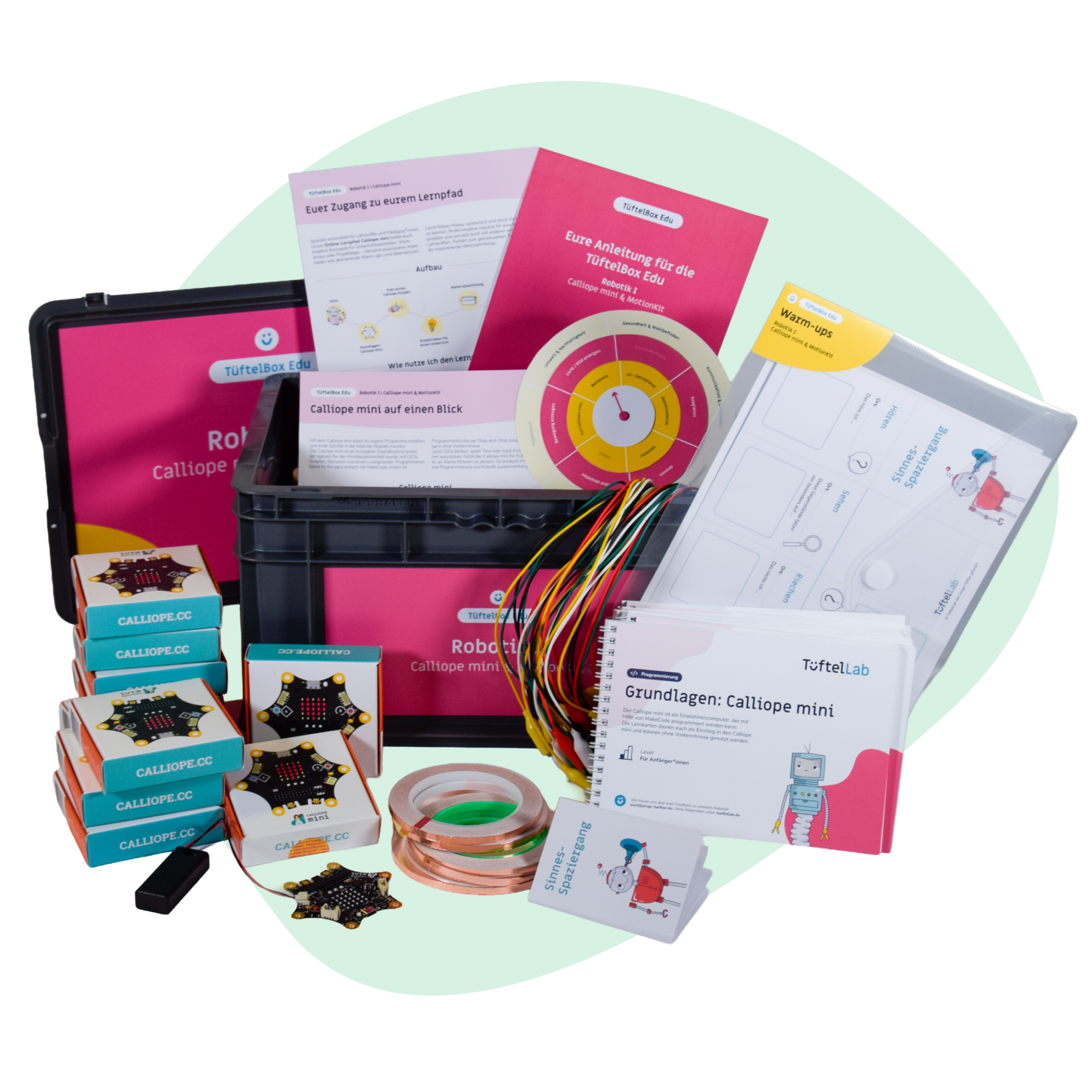 Mit unserer TüftelBox Edu erhaltet ihr den Calliope mini, das MotionKit, Sensoren und Motoren als Klassensatz, sowie vielfältige Inspirationen und sofort einsetzbares Lernmaterial.