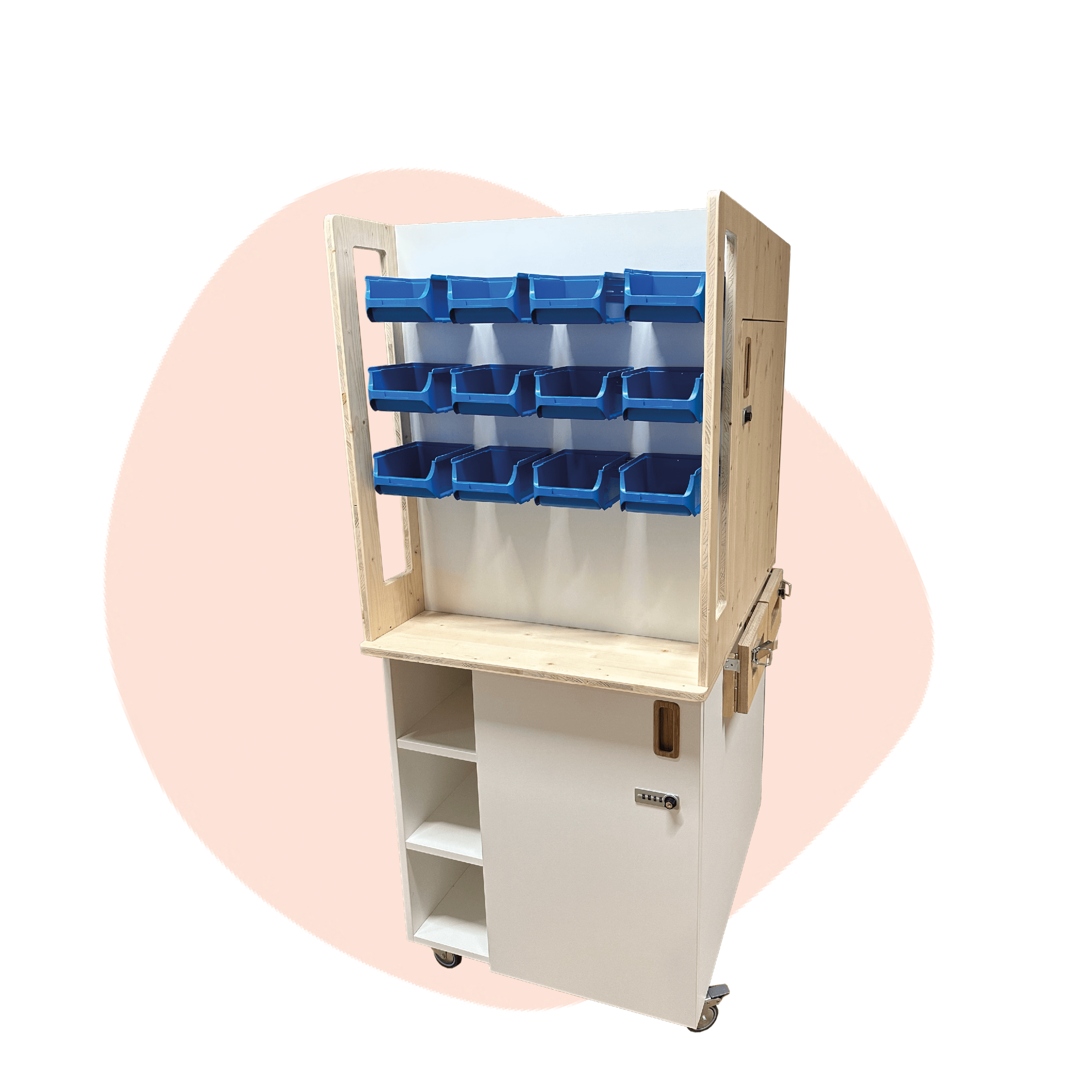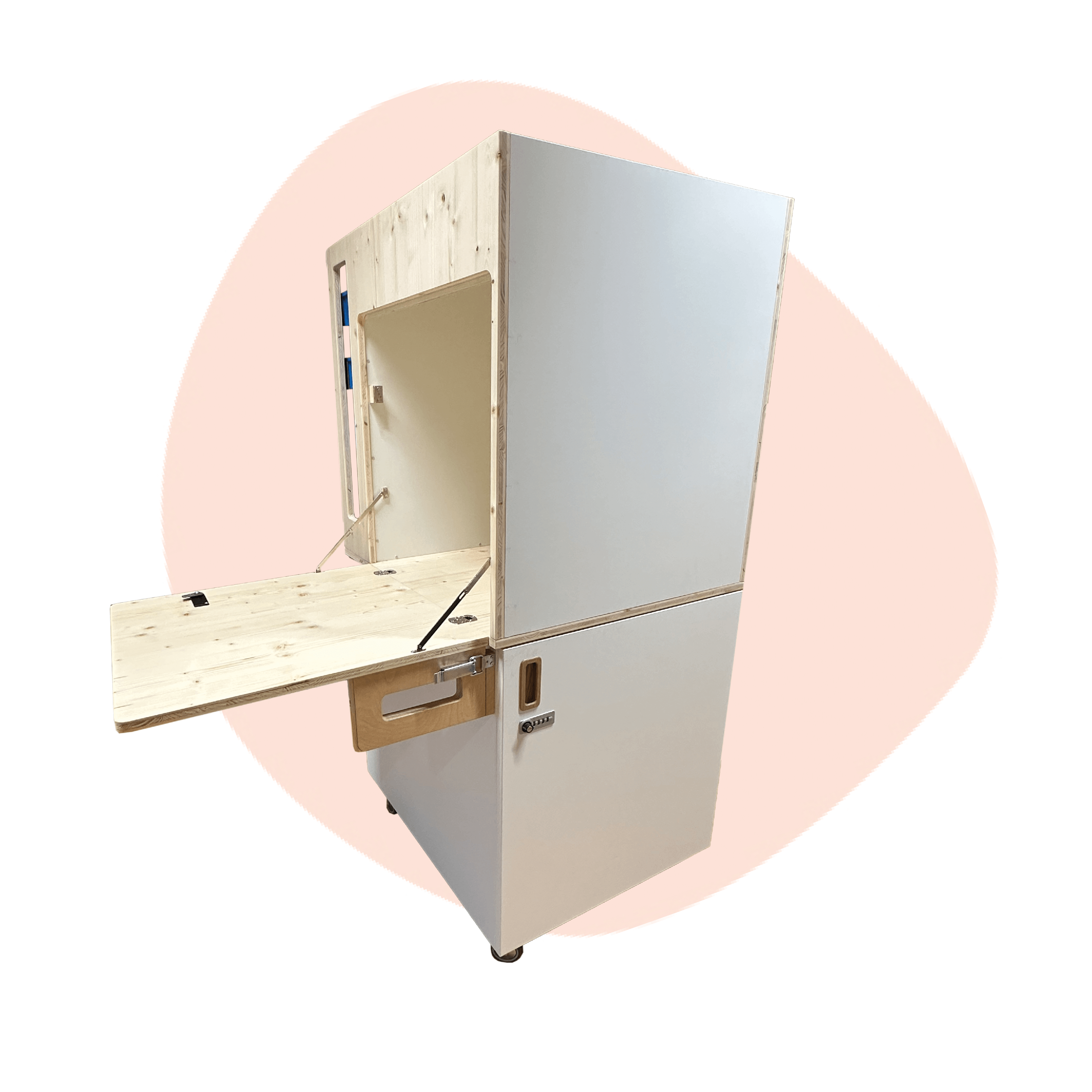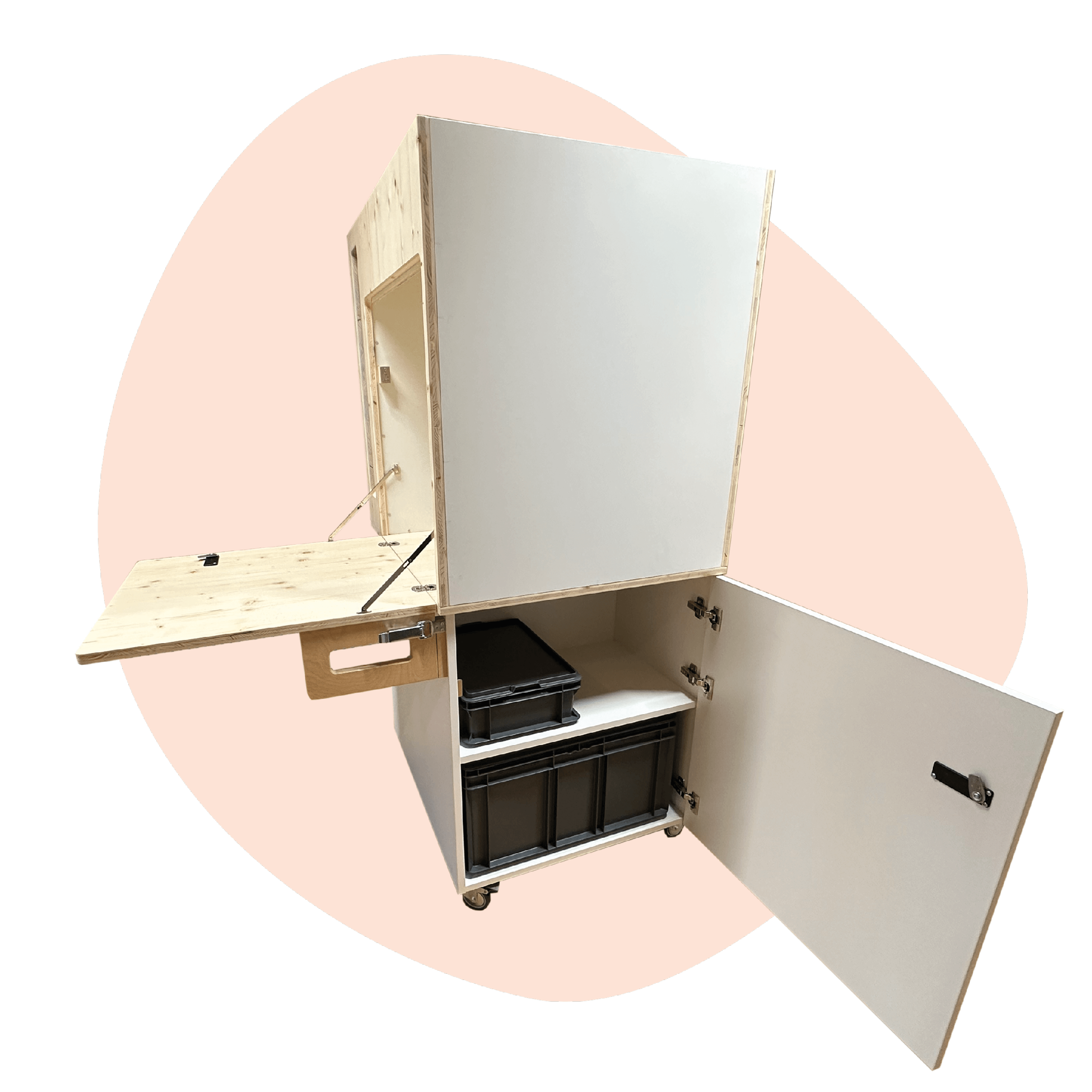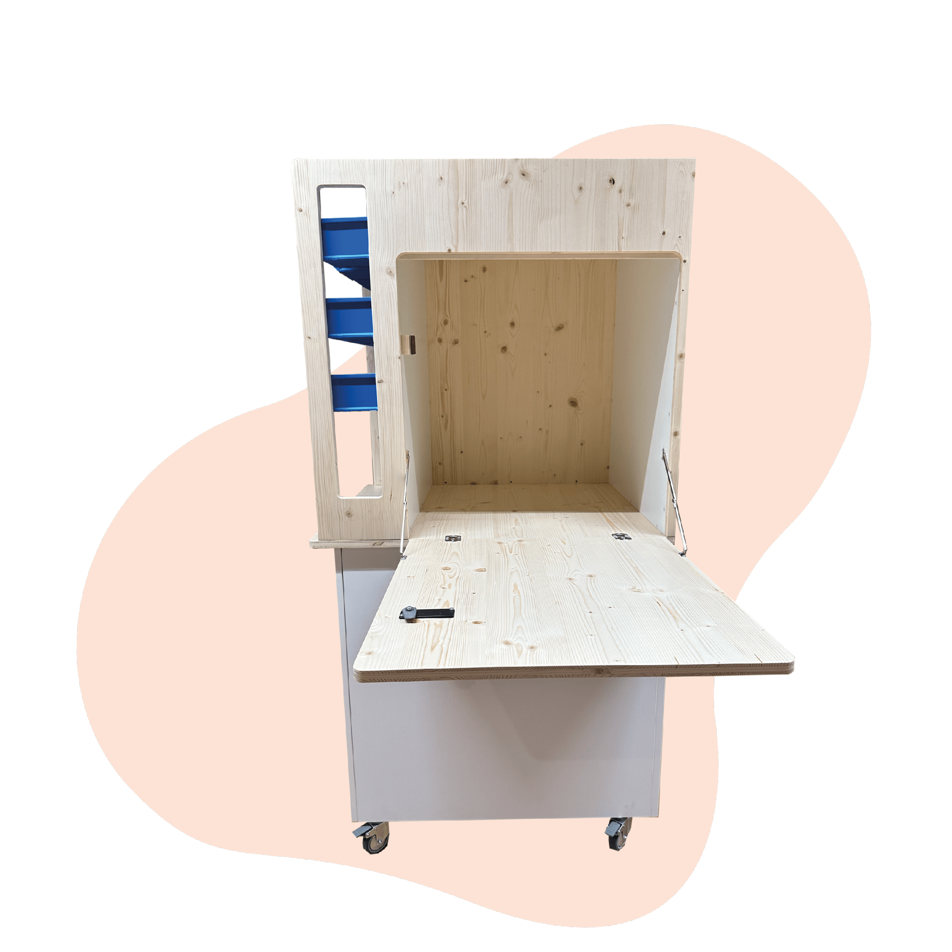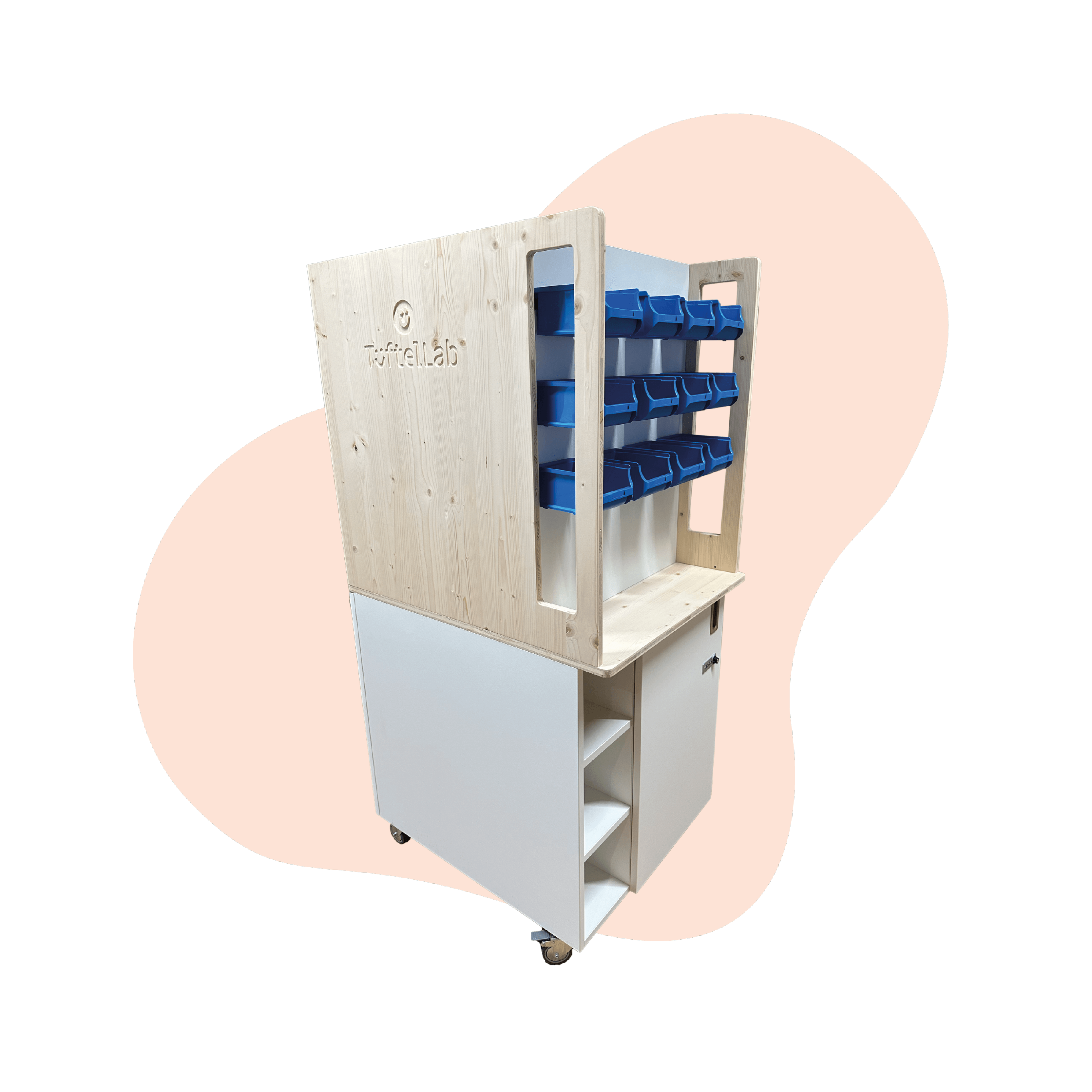 Unser TüftelSchrank Making ist extrem flexibel einsetzbar. Er passt durch jede Schultür und kann rollend ins Klassenzimmer oder euren Makerspace gefahren werden. Eure Materialien sind durch verschließbare Fächer sicher gelagert und an einem Ort. Zudem gibt es ausreichend Platz und Struktur für die Unterbringung von Bastelmaterial in Sichtlagerkästen. Und das Beste ist: dein 3D-Drucker ist sicher und staubfrei untergebracht. Öffne zum Tüfteln einfach die Arbeitsfläche!